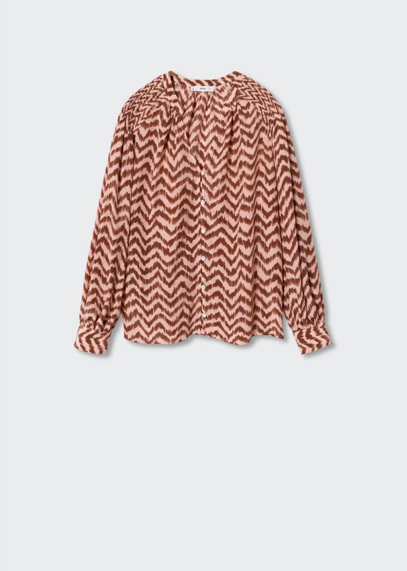 Committed Kollektion Fließender Stoff Print-Design Streifen-Dessin Zweifarbiger Print V-Ausschnitt Lange Ärmel Knopfverschluss vorne Als "Committed" gekennzeichnet Kleidungsstücke sind Produkte, die mit Fasern und/oder nachhaltigen Produktionsverfahren zur Reduzierung der Umweltauswirkungen hergestellt wurden. Ziel von Mango ist es, die Einführung umweltfreundlicherer Praktiken zu unterstützen und somit die Anzahl nachhaltiger Kleidungsstücke in der Kollektion zu erhöhen.