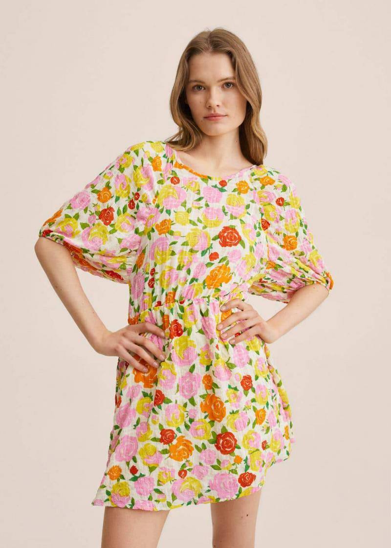 Ausgestelltes Design Langes Design Kurzes Design Fließender Stoff Blumen-Print Rundhalsausschnitt Kurzer Ballonärmel Kurzarm mit elastischen Bündchen Schlitz hinten Rückwärtige Schleife…